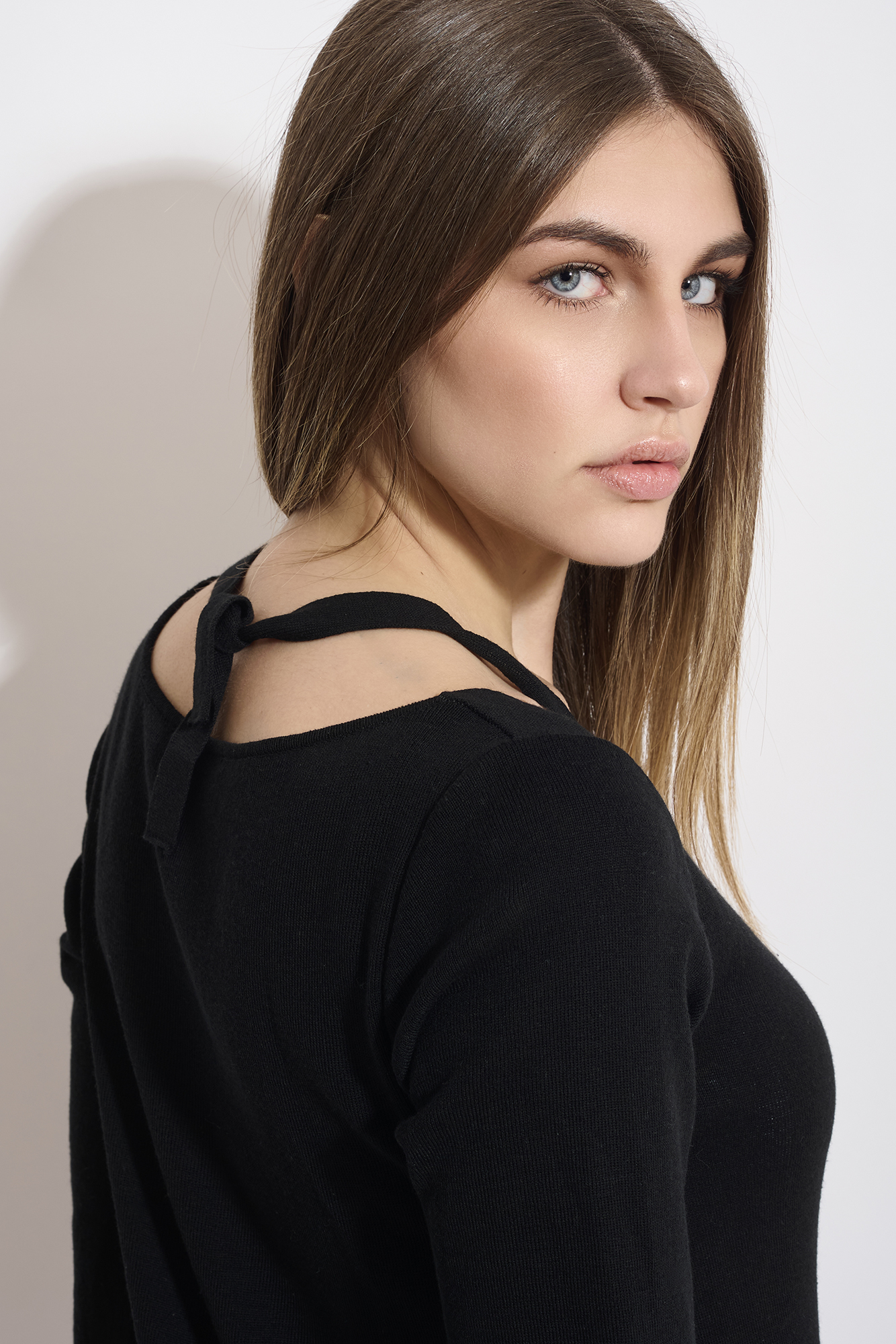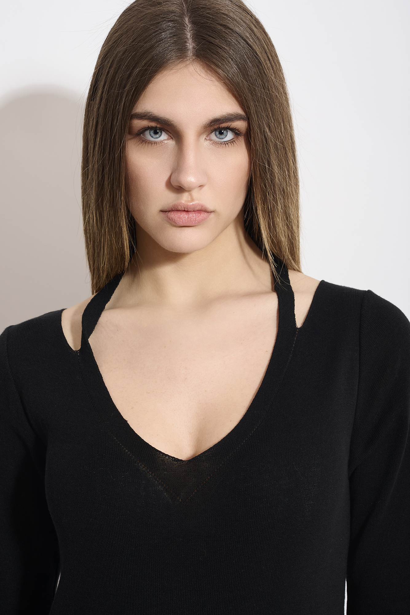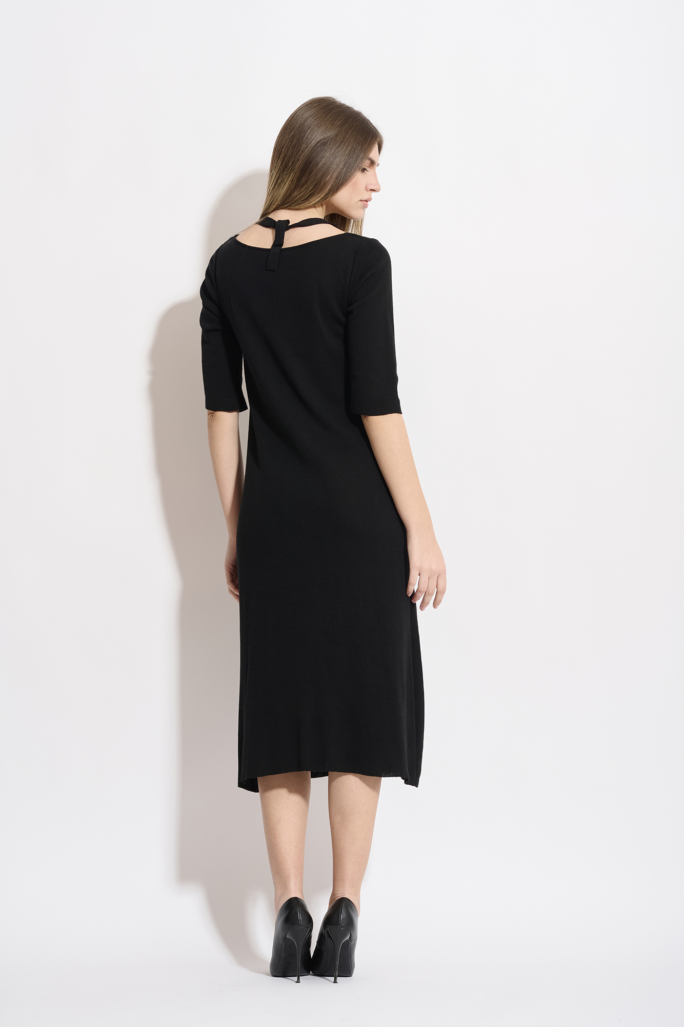 Abito caratterizzato da uno scollo a V, profondo allacciato al collo che crea un effetto a strati sulle spalle. Maniche a 3/4, appena svasato.