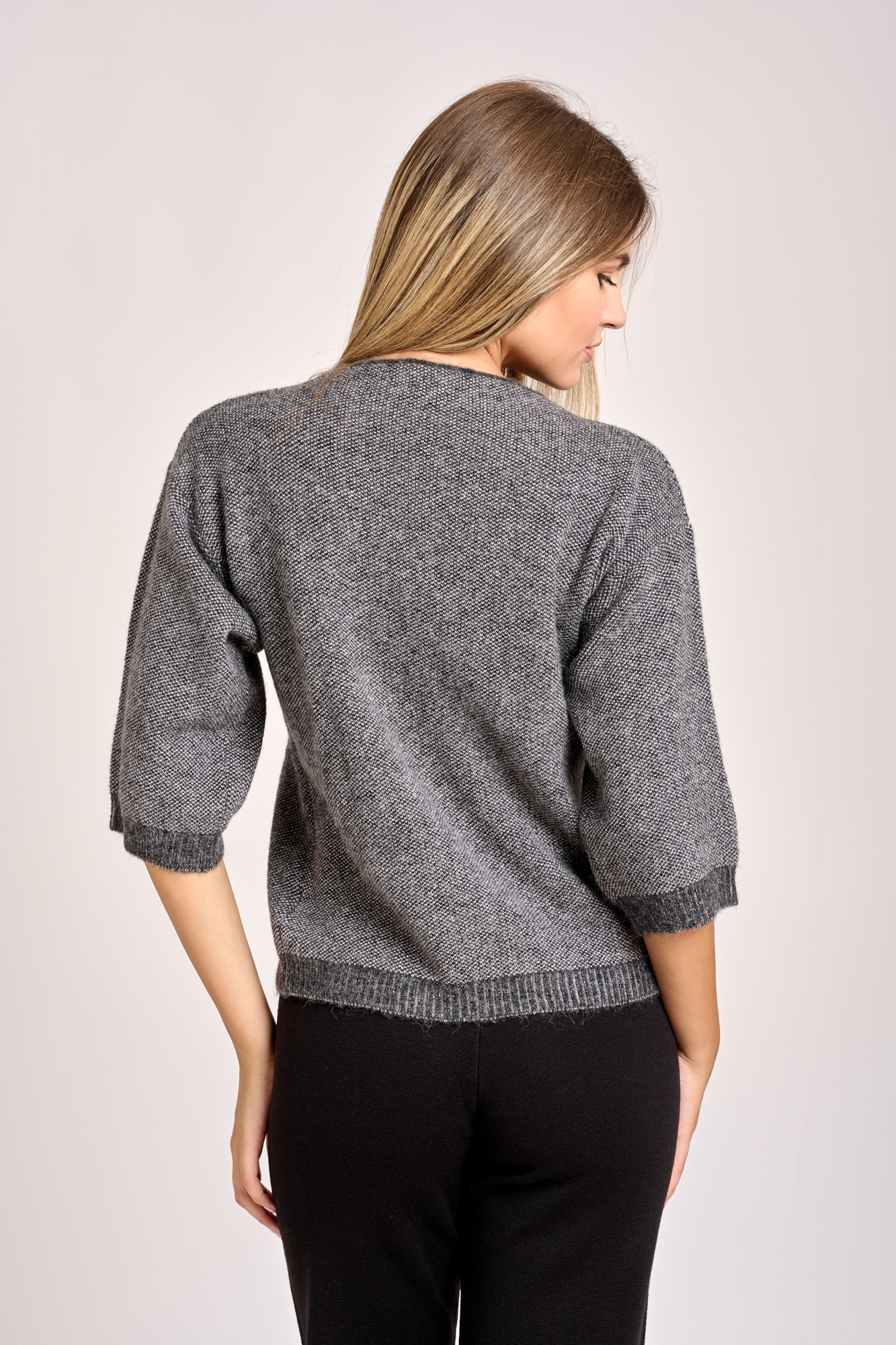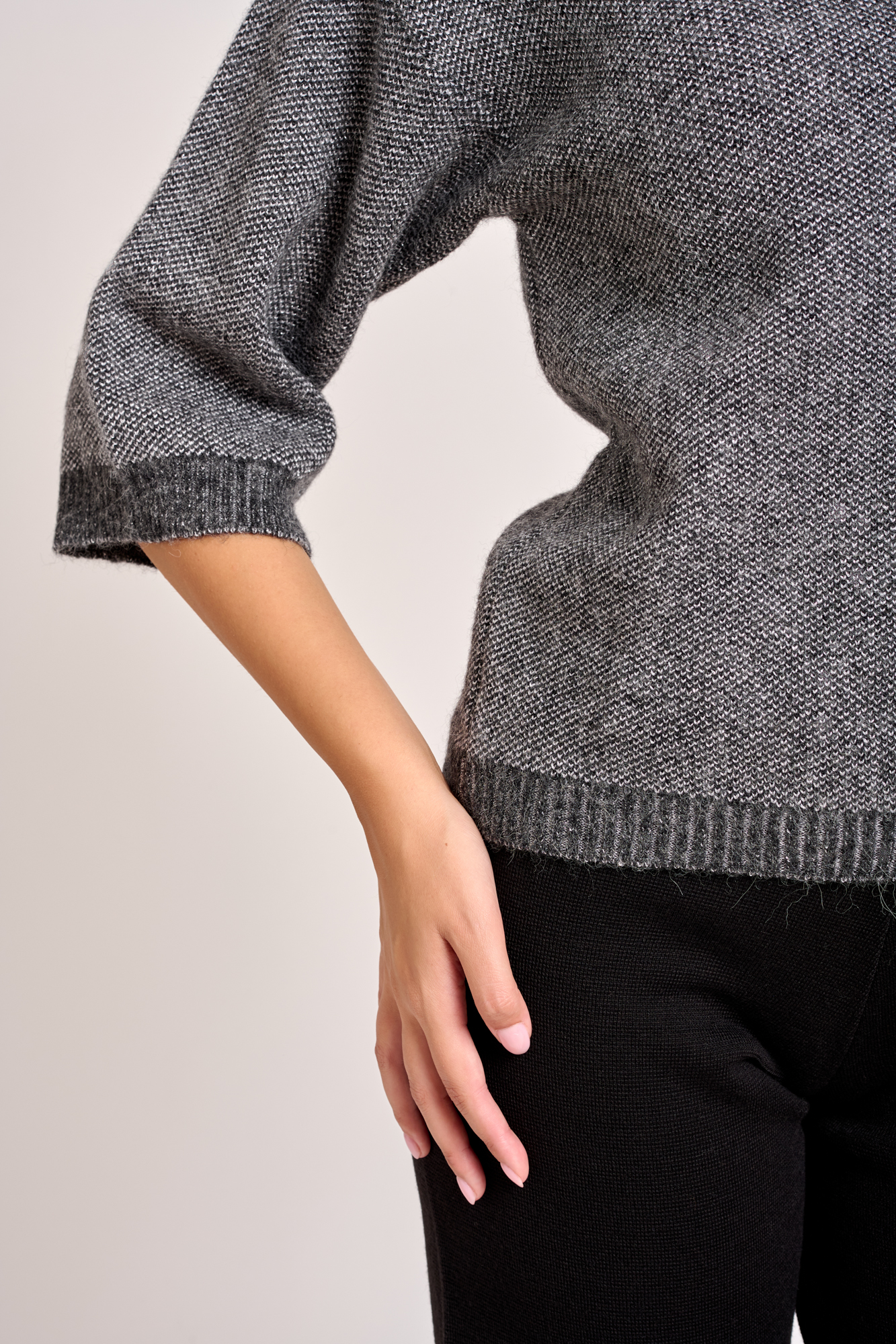 La maglia presenta un collo leggermente a cratere, maniche scese polsino a costine e leggermente largo. Ha una leggera brillantezza con effetto lurex visibile nel tessuto. La trama rasata a coste sottili verticali. La modella รจ alta 1,78cm e indossa una taglia 42