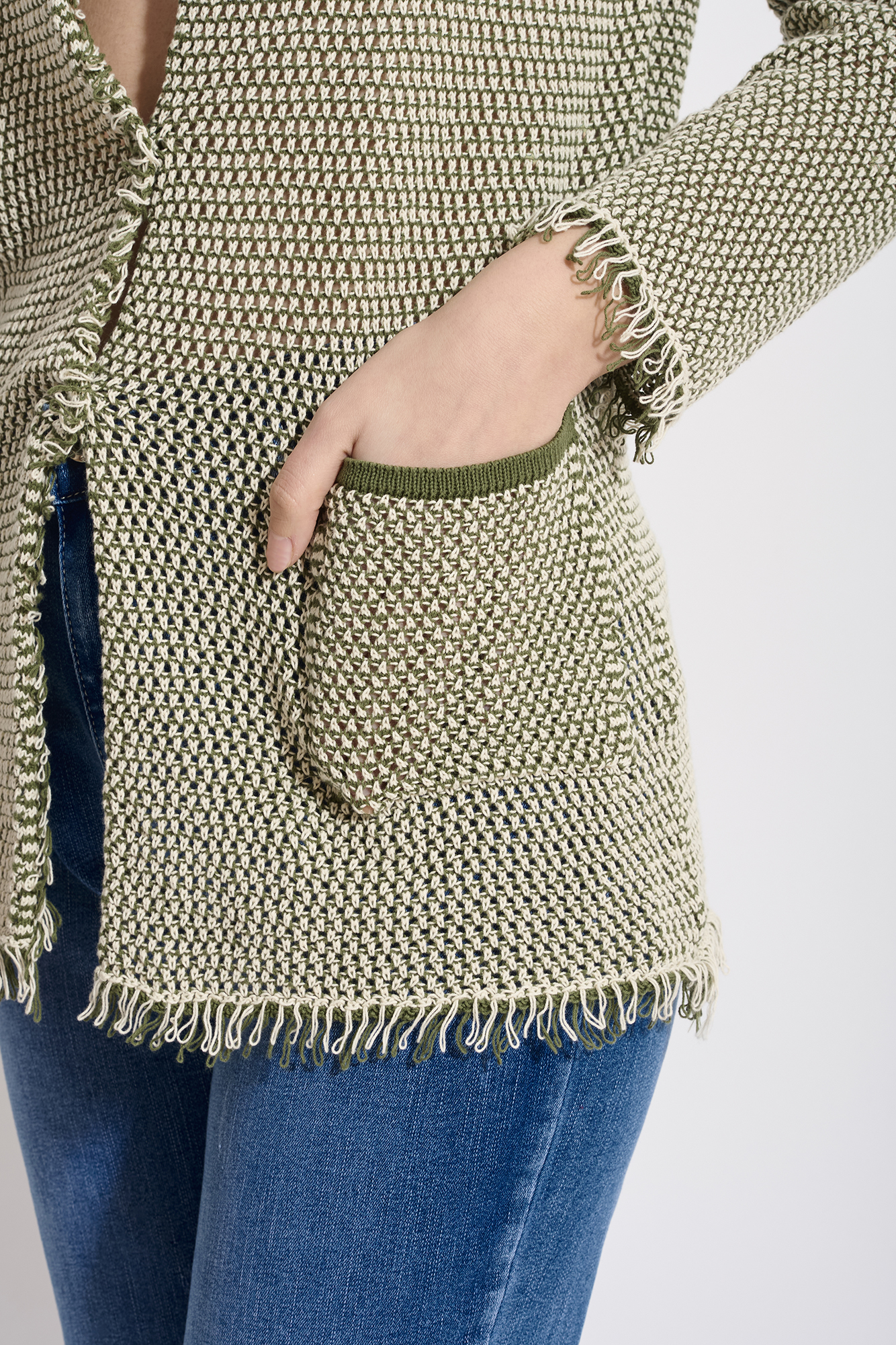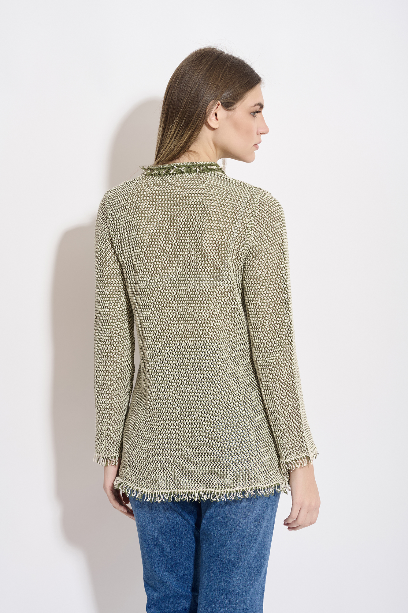 Cardigan scollo rotondo e maniche lunghe con bordi sfrangiati. Tasche piatte applicate sul davanti chiusura frontale con gancetti a scomparsa. Una rivisitazione contemporanea della classica giacca tweed. Ideale per un look raffinato ma casual.