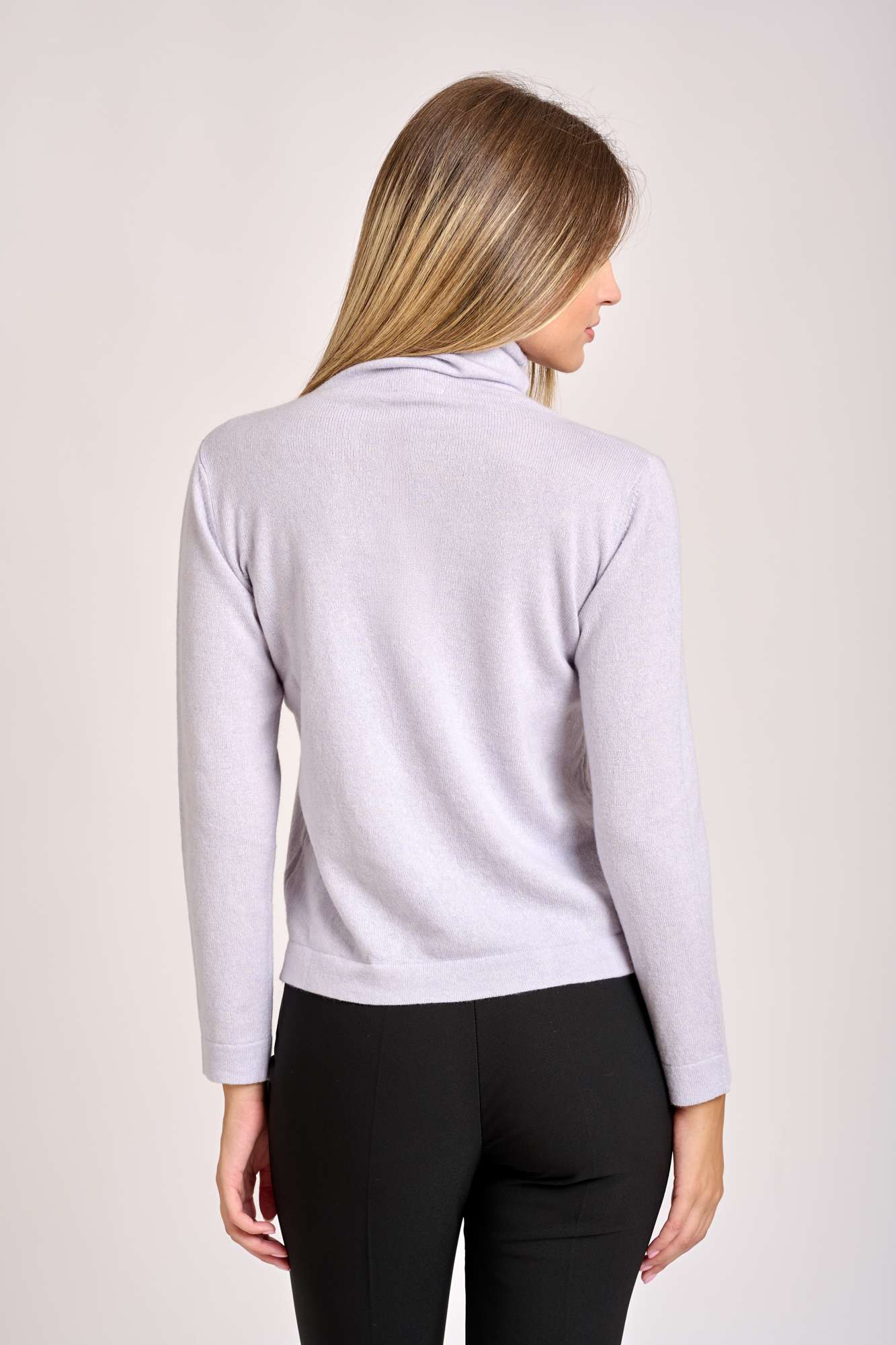 Maglia collo con alto a cratere manica larga lavorazione rasata, presenta uno spacco laterale sull’ orlo un capo versatile, adatto a un look casual o più elegante a seconda degli abbinamenti. La modella è alta 1,78cm e indossa una taglia 42