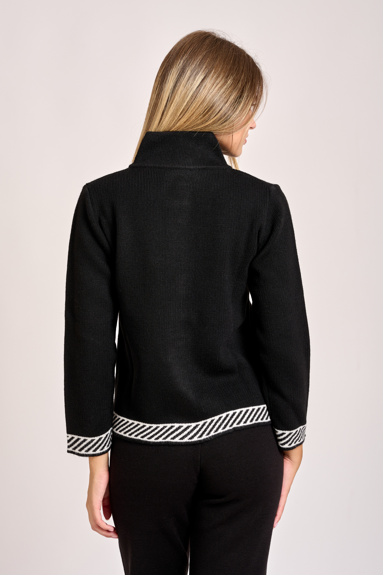Giacca bordo spigato: presenta un taglio dritto e una chiusura frontale, evidenziata da una fascia verticale. I polsini delle maniche riprendono i motivi della fascia verticale, l’ insieme dei dettagli conferisce al capo un aspetto geometrico e moderno, adatto a un look casual.