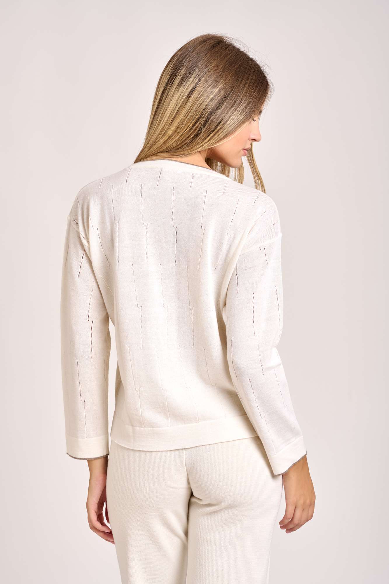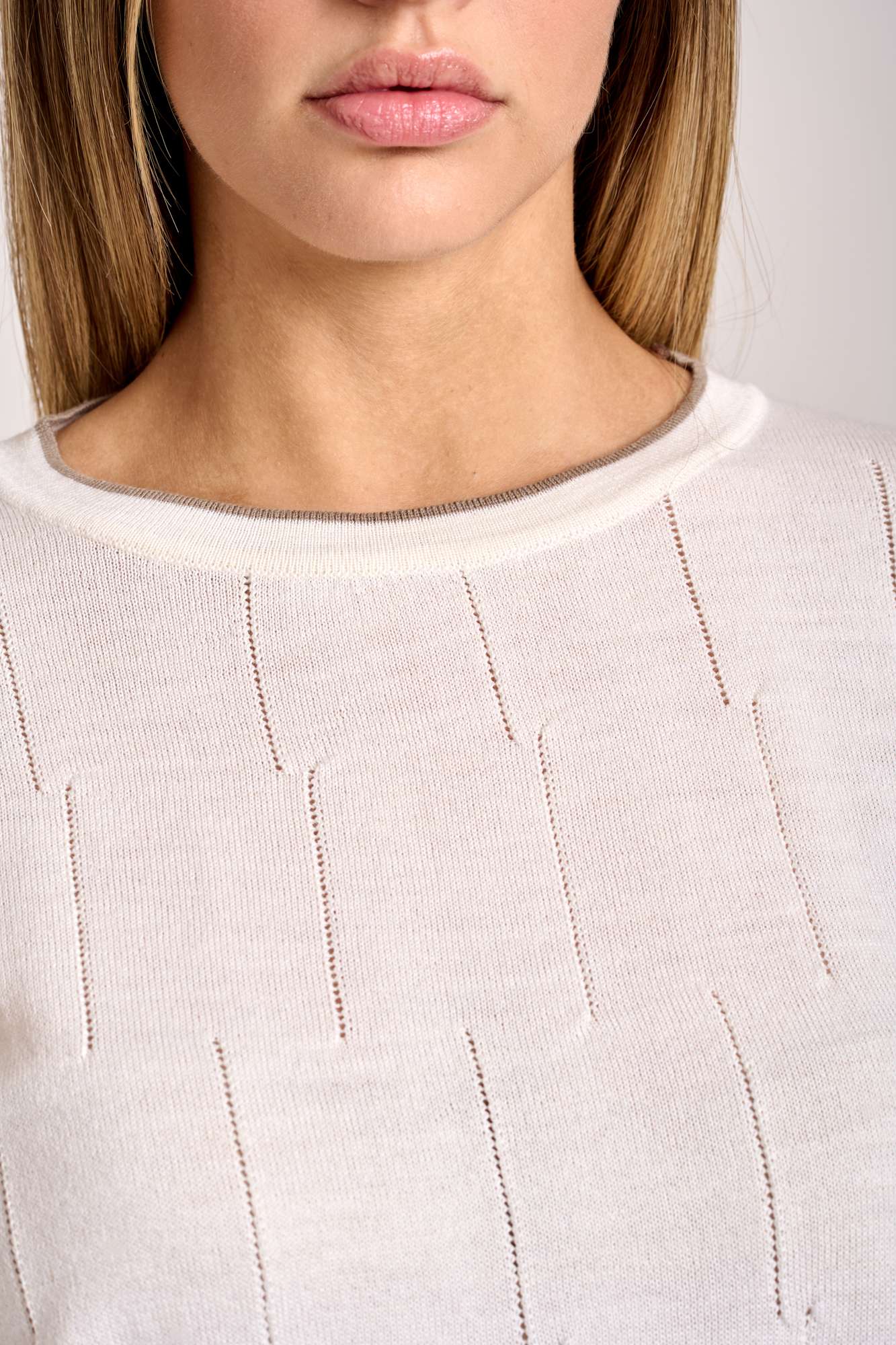 Presenta una trama a coste orizzontali sula manica e verticali sul davanti, effetto leggermente testurizzato. La maglia a un taglio dritto un design minimalista con un elemento dato dai bordi di colore a contrasto sul collo e polsini.
