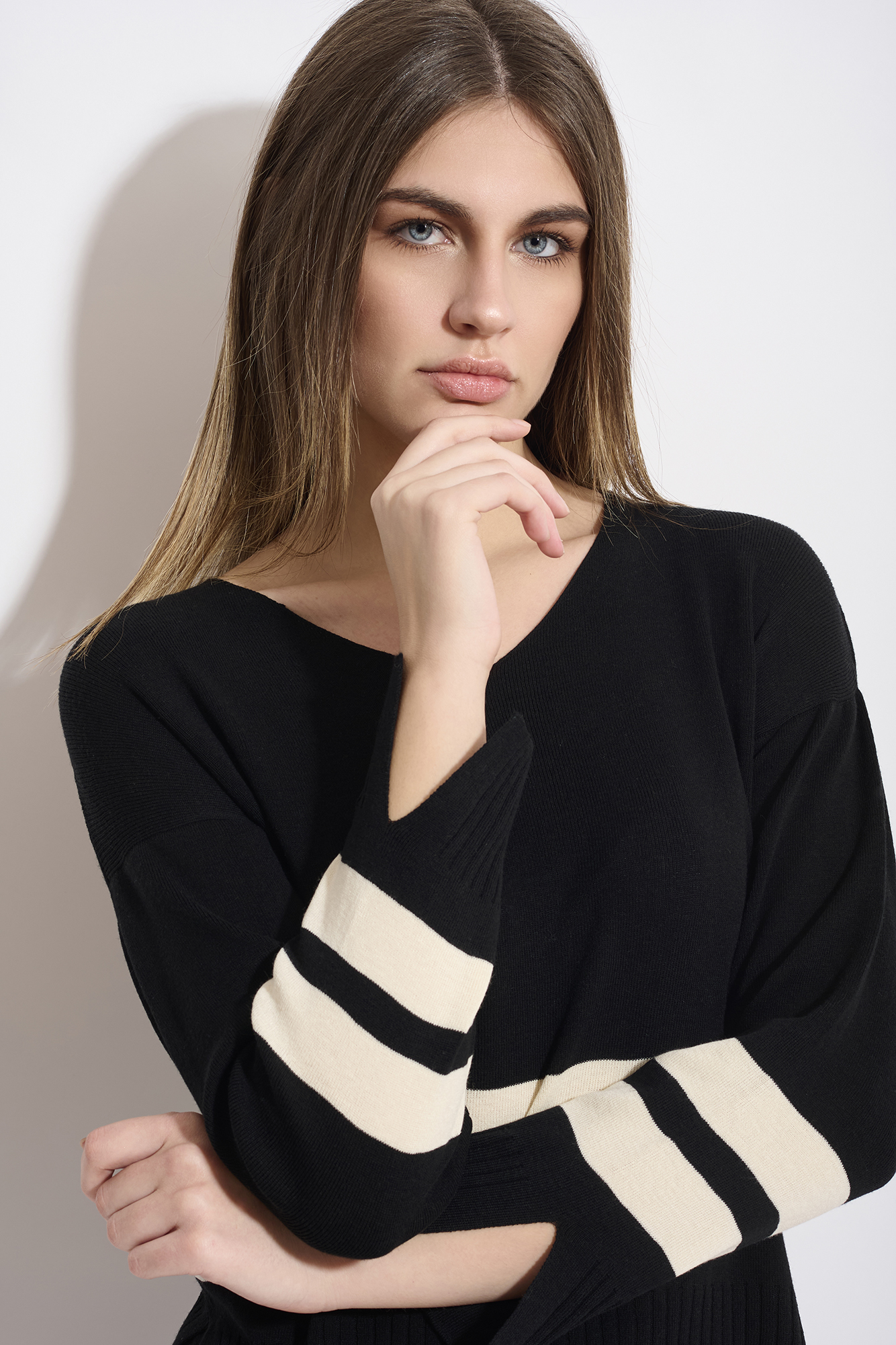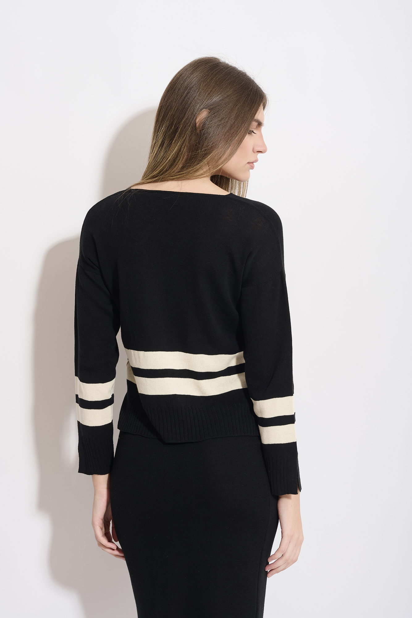 Maglia nera a righe beige con scollo a V, manica lunga con polsino alto piรน spacchetto. Base nera con una riga orizzontale a contrasto, fondo fianchi con costine piรน spacchetti laterali.